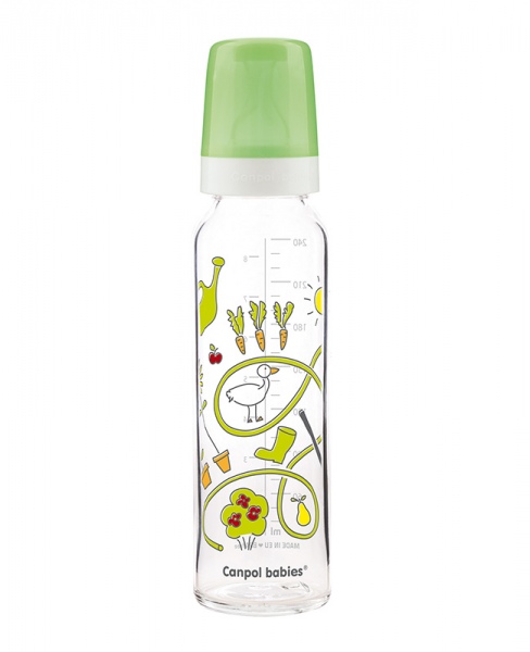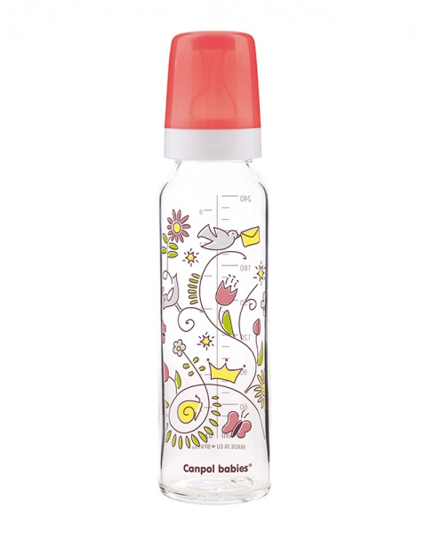 Wykonana jest ze szkła borokrzemowego. Trwała, bezpieczna i stabilna, o czytelnej skali. Standardowo wyposażona w smoczek silikonowy antykolkowy okrągły o przepływie szybkim (3). Butelka może być poddawana wielokrotnej dezynfekcji poprzez gotowanie we wrzącej wodzie lub w sterylizatorze parowym.