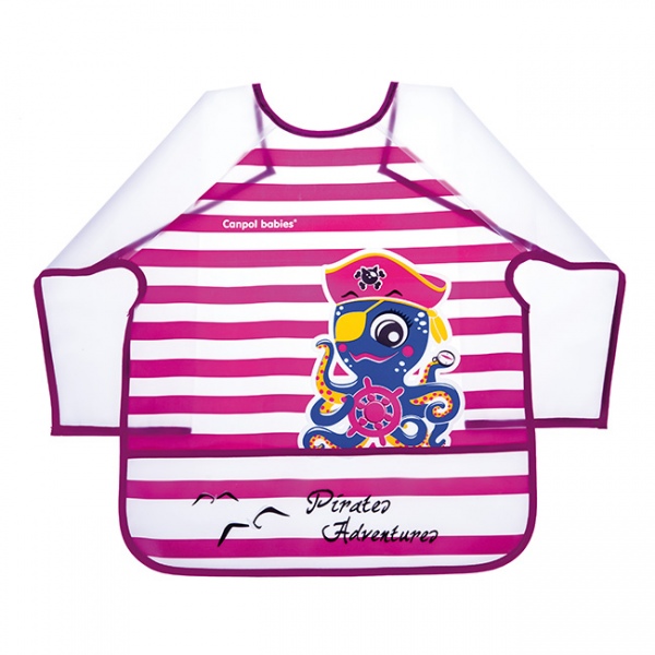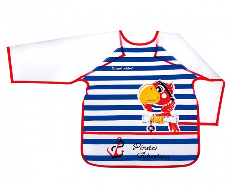 Fartuszek z długimi rękawami zabezpiecza ubranko dziecka przed zabrudzeniem w czasie jedzenia lub zabawy.